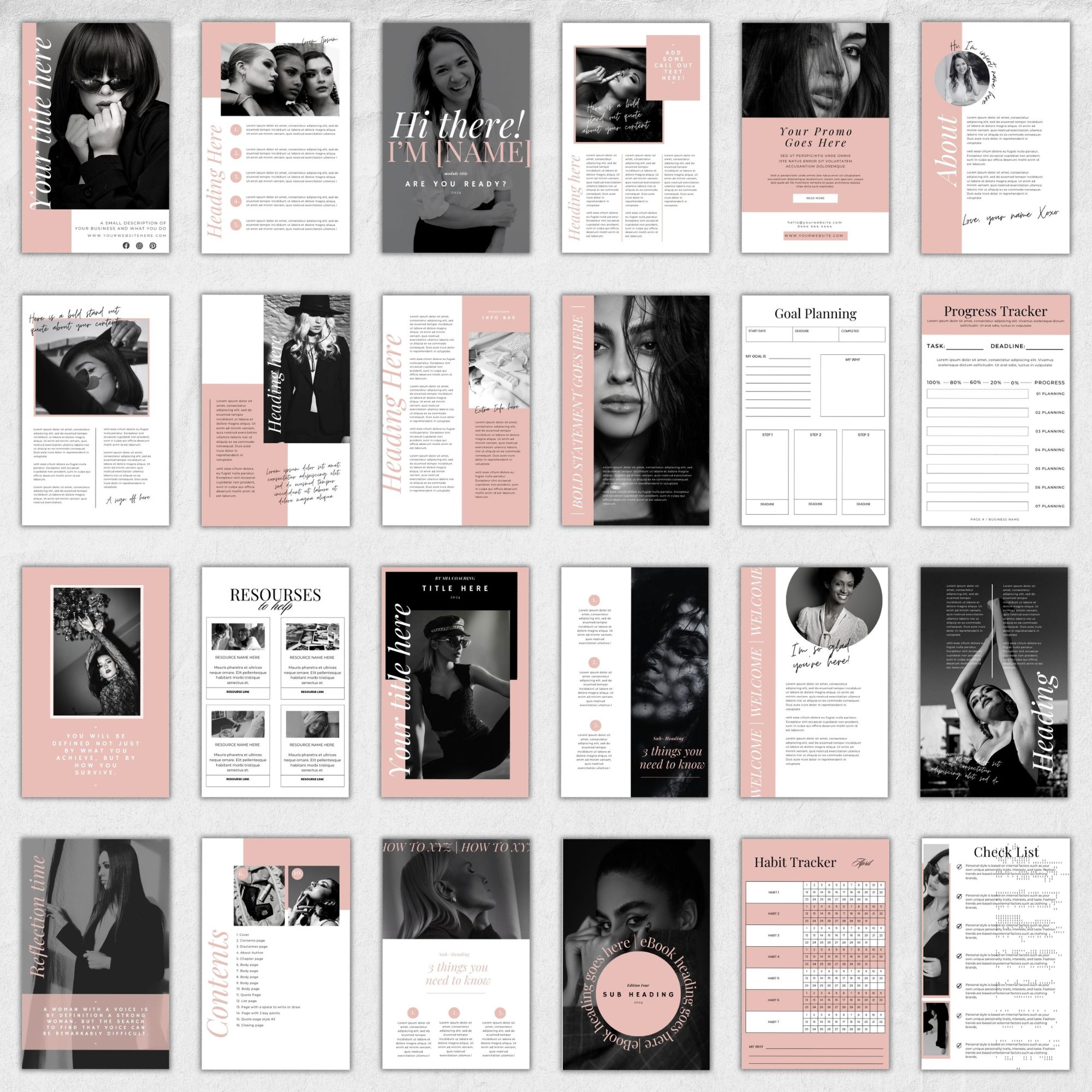 Pink Canva eBook & Workbook Template with 50 professionally designed pages, created for coaches, course creators, and digital product sellers who want to design polished workbooks quickly and easily.