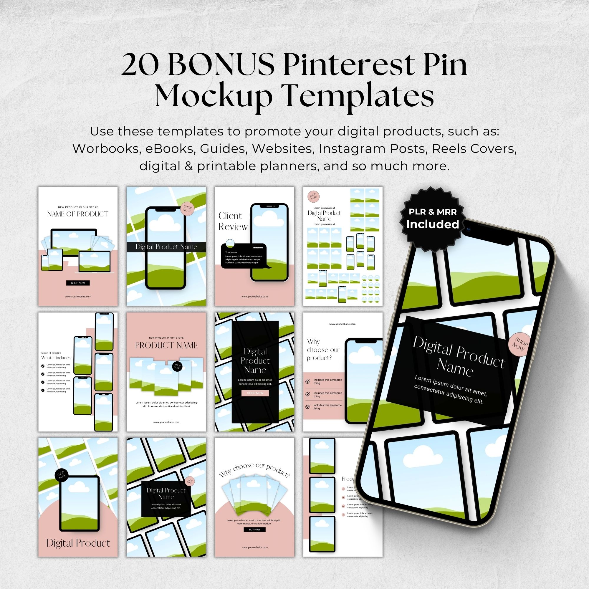 You will also receive 20 BONUS Pinterest Pin Mockup Templates, making it easy to promote your digital products and attract traffic to your website, Etsy shop, or social media.