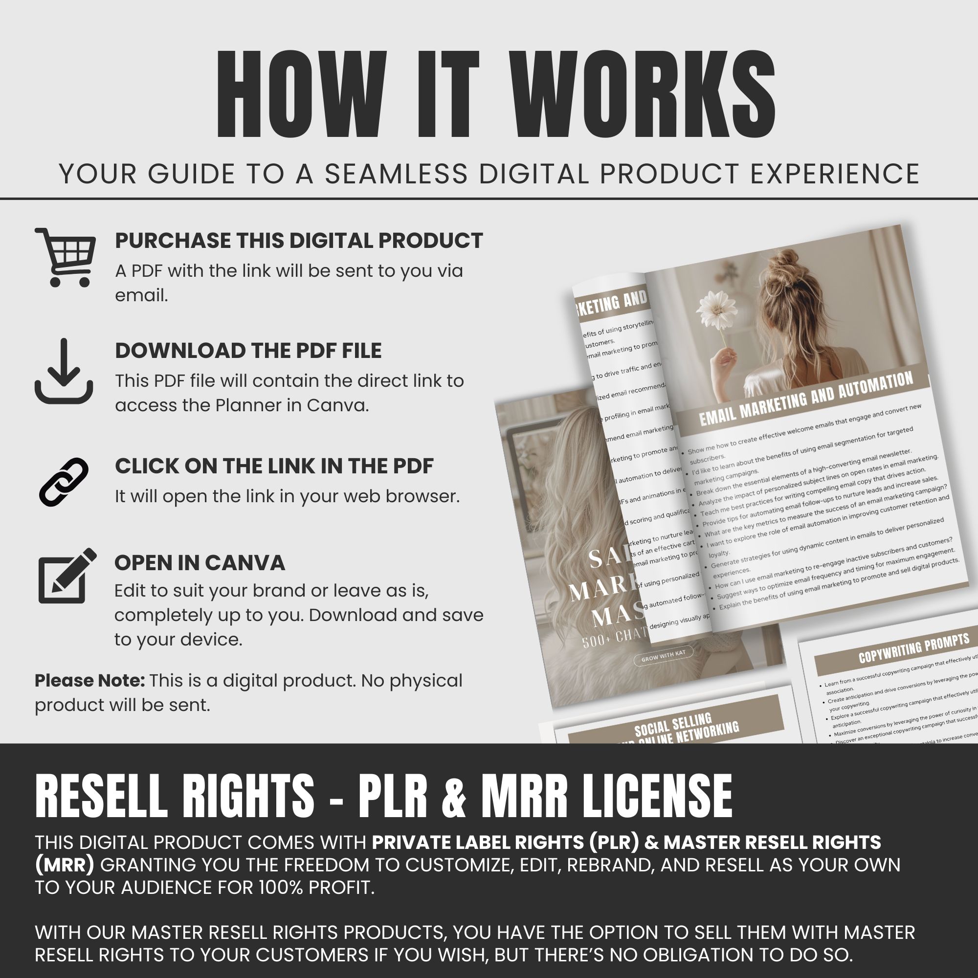 With Master Resell Rights, you're not just purchasing a product; you're investing in a versatile asset. Utilize the prompts to enhance your own business, adapt them to suit your unique needs, or resell them as part of your offerings. The opportunities are limitless.